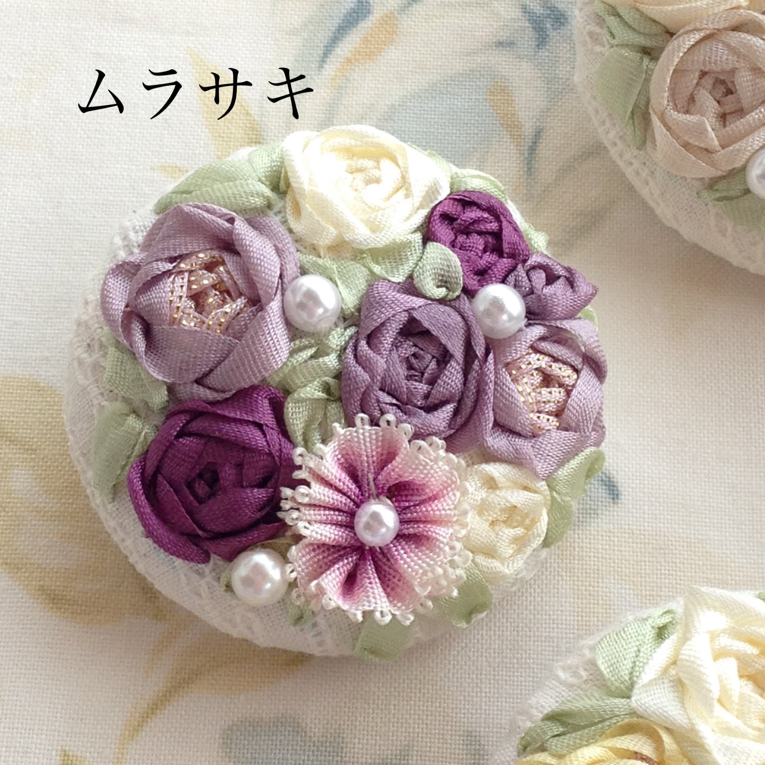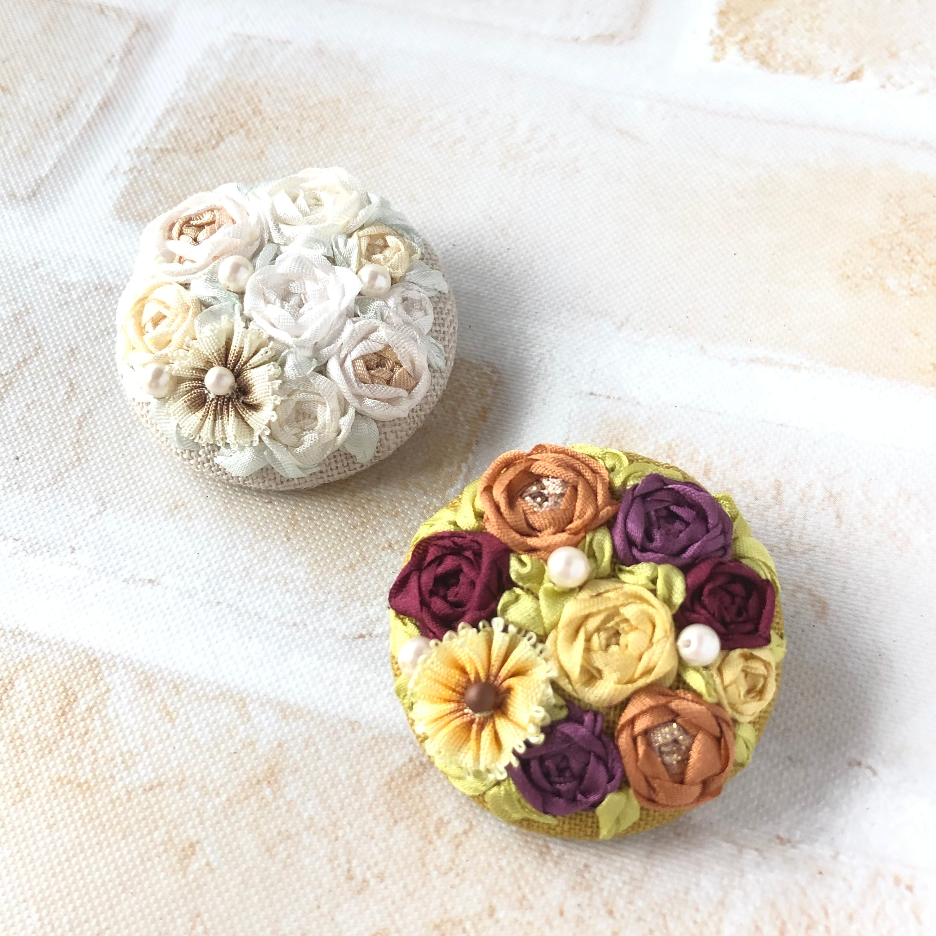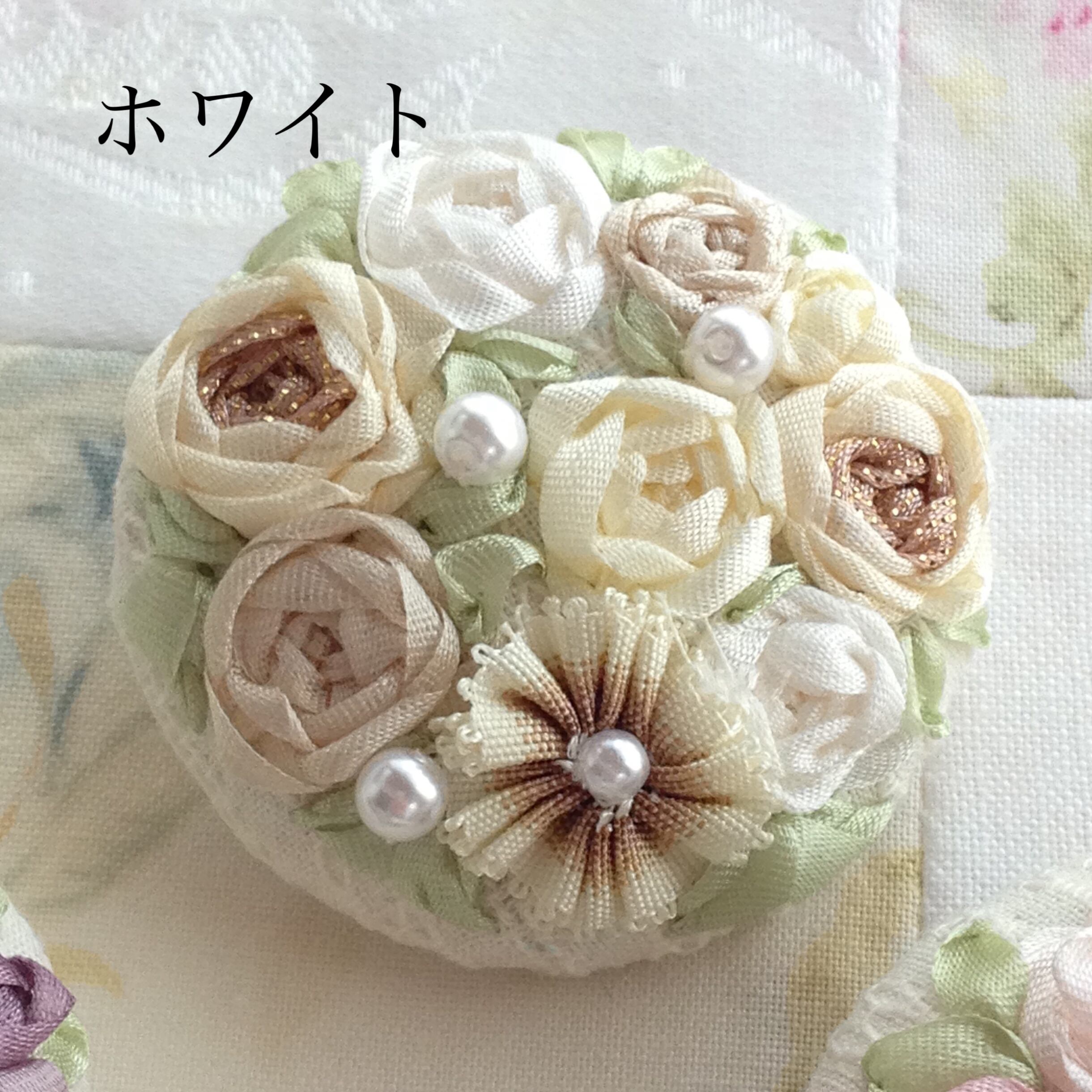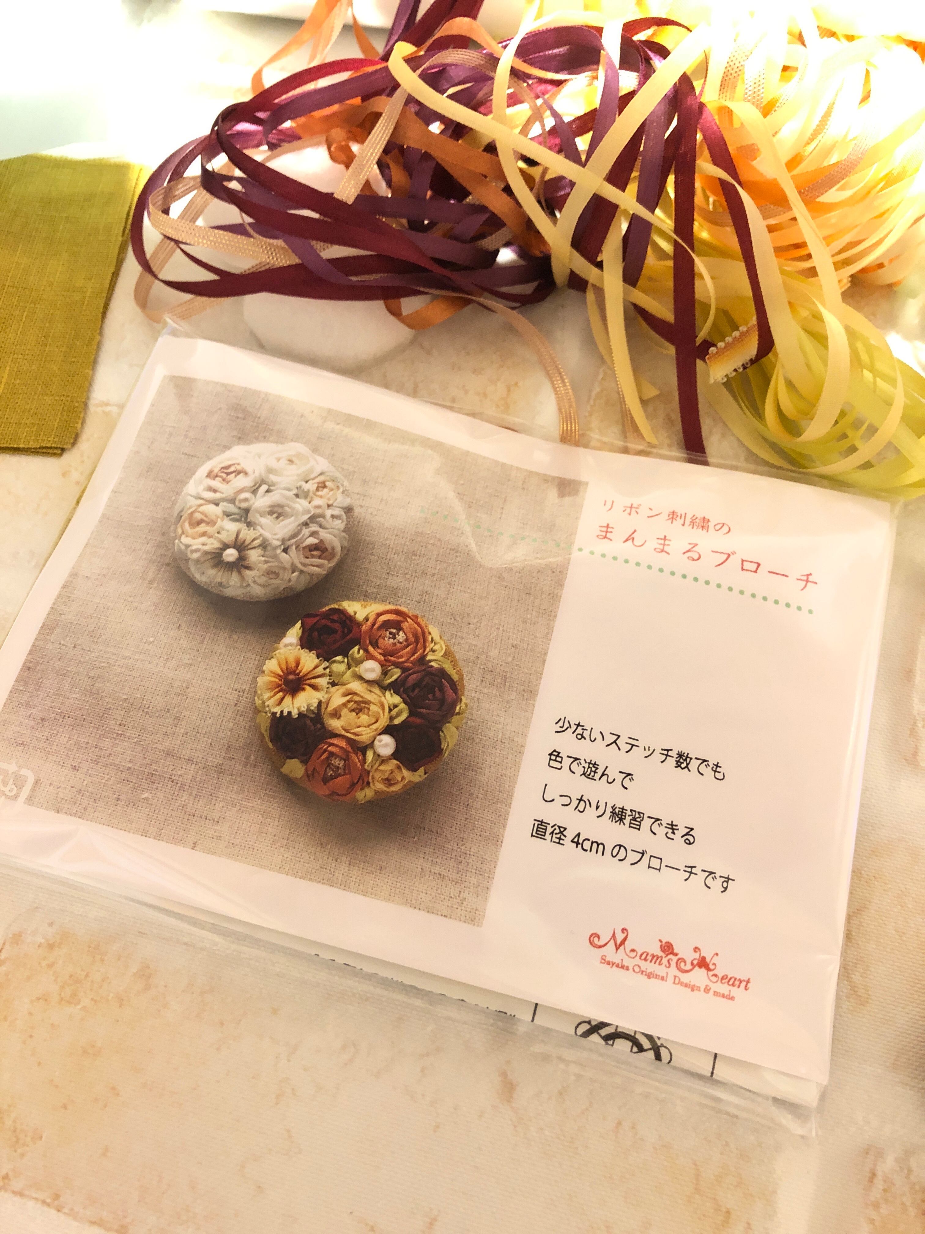 土台布、刺繍用リボン、ビーズ、キルト芯貼り包みボタン、ブローチピン付き裏台紙