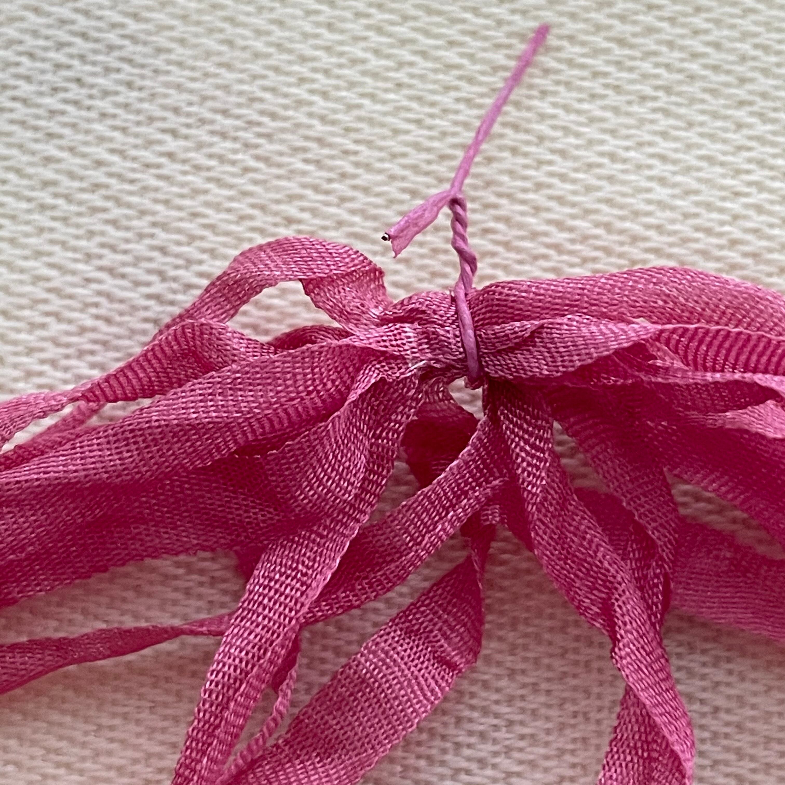 アイロンは絹の適温でアイロンを置いてリボンの方を引っ張ると手早く仕上がります(時々アイロンを起こして台を冷ましてください!)