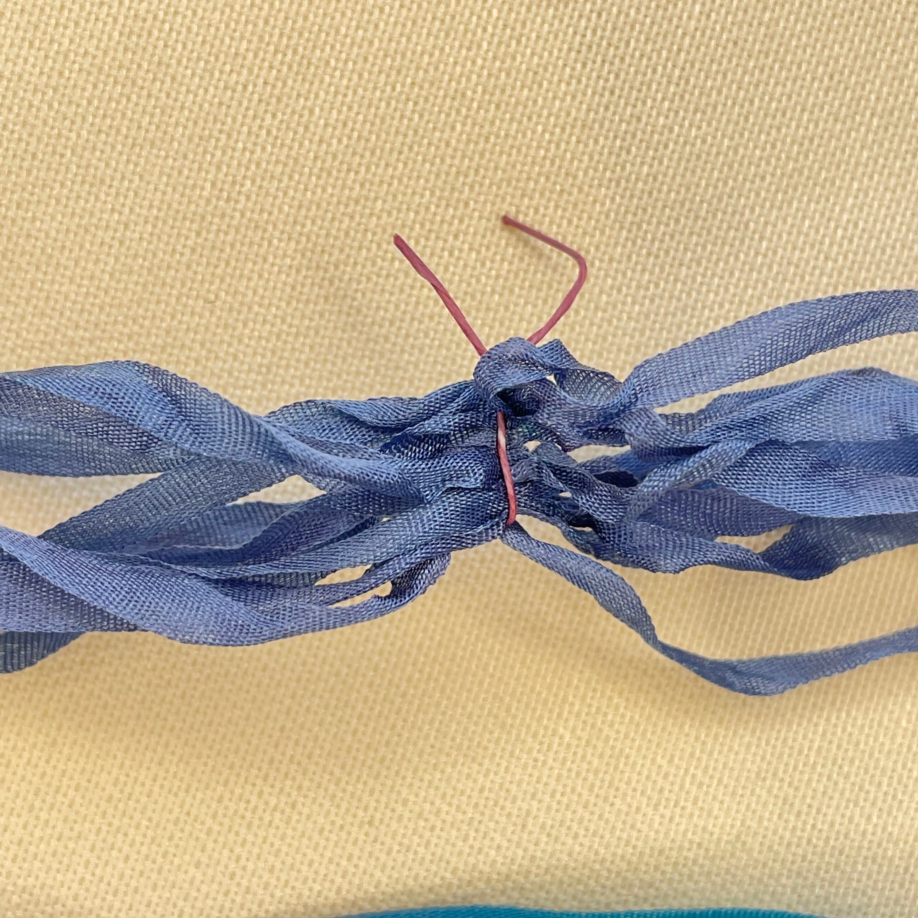 アイロンは絹の適温でアイロンを置いてリボンの方を引っ張ると手早く仕上がります(時々アイロンを起こして台を冷ましてください!)